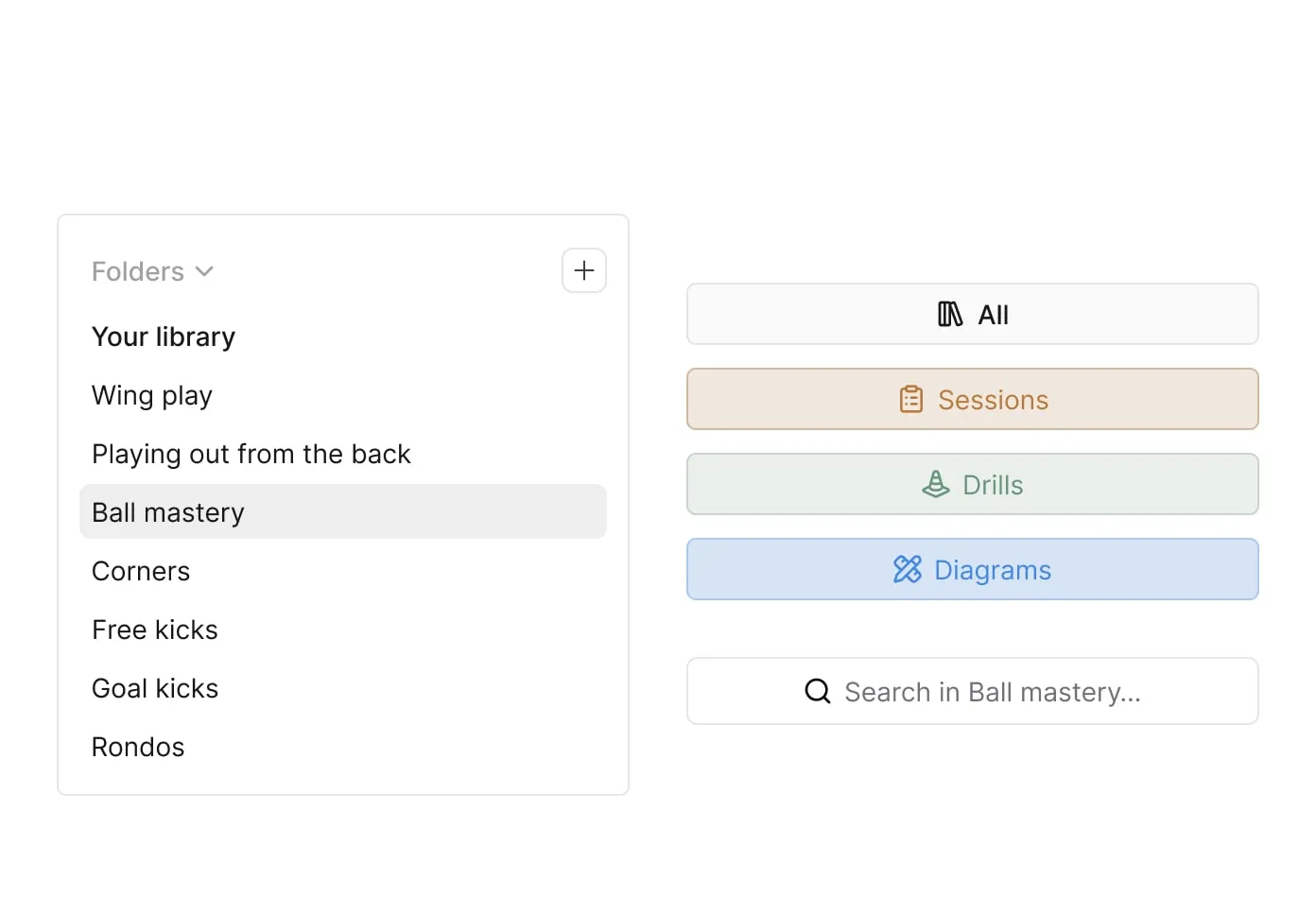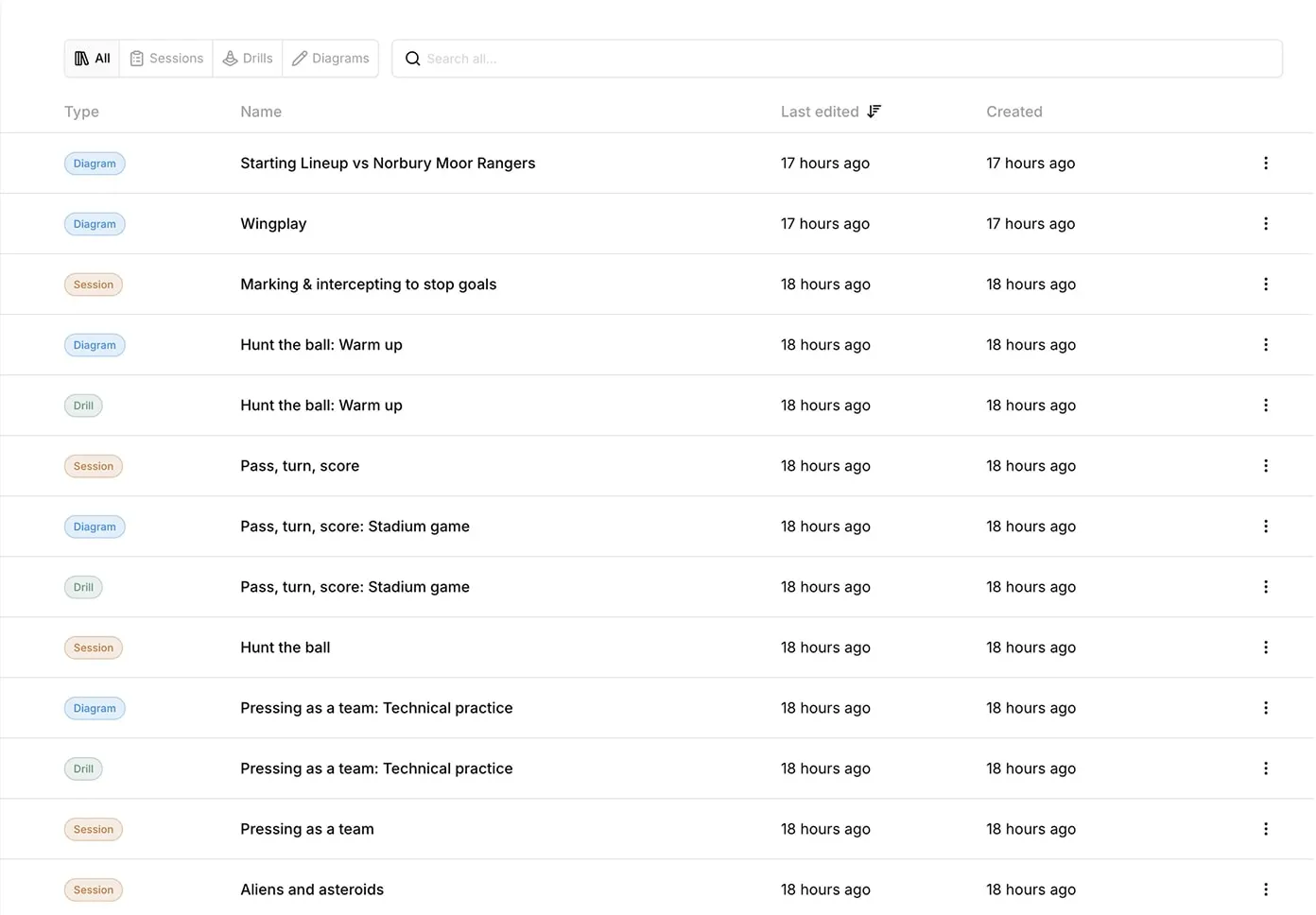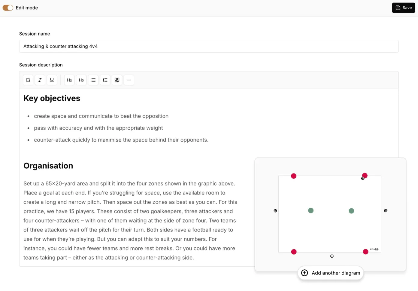 Create multi-part sessions from a single page, or create individual drills and diagrams that can be reused across sessions to save you time in the future.