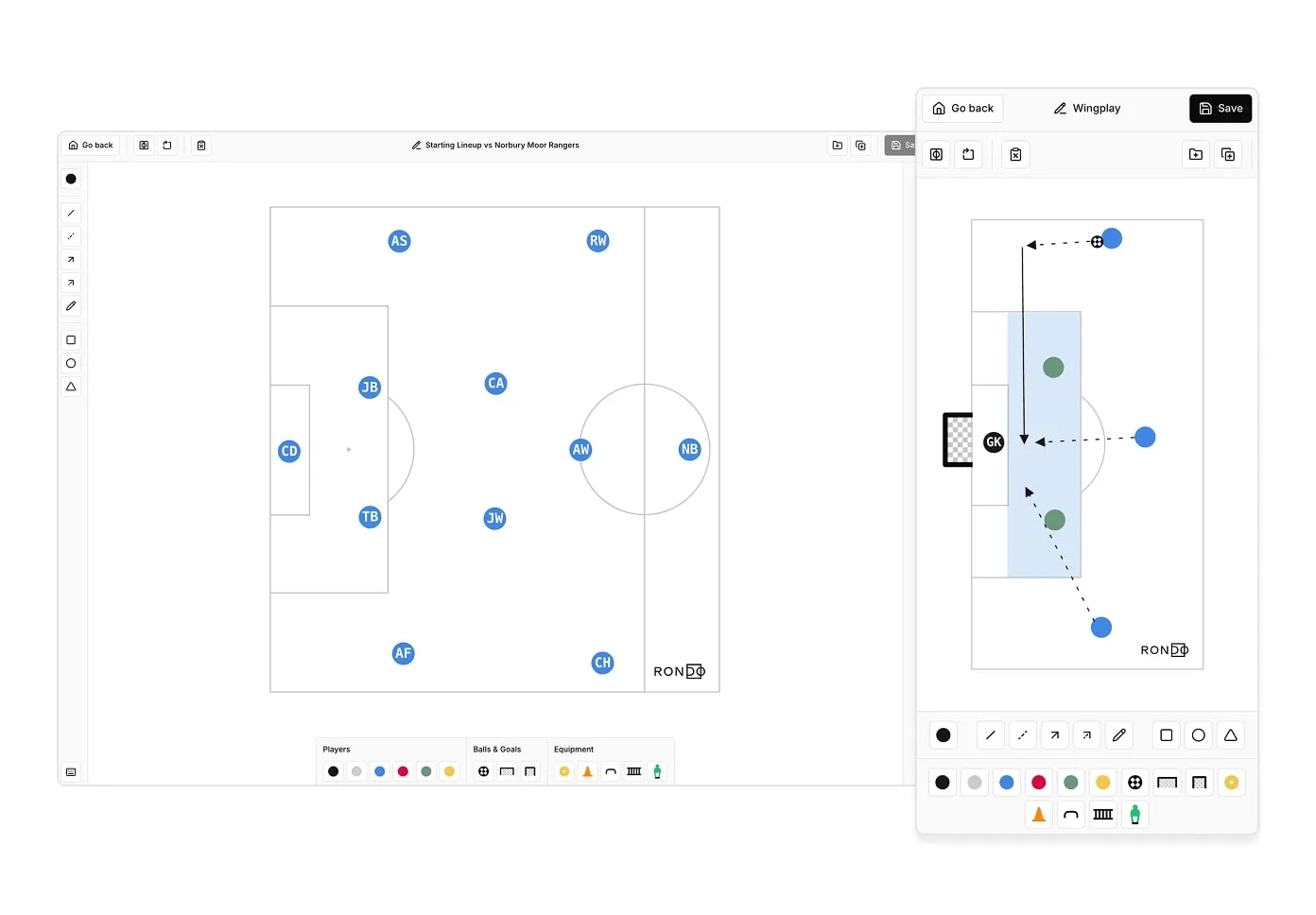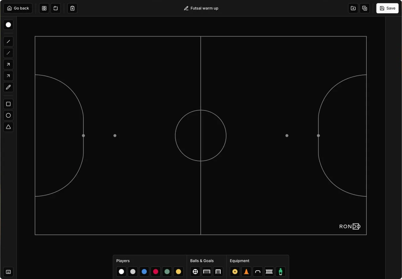 We have a variety of tools and equipment available including straight and curved lines and arrows, free drawing, shapes (rectangles, circles and triangles), players, balls, goals, cones, hurdles, ladders and mannequins. If there is something missing, you can email us and we’ll certainly consider it.